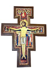 This stunning San Damiano cross is handcrafted by an artisan in Assisi. It features a thick cut wood border and is a beautiful replica of the original San Damiano Cross which hangs in the Basilica of St. Clare in Assisi, Italy. The cross is one inch thick and comes with a mountable backing for a hook or nail.