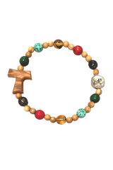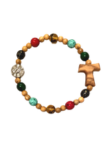 This handmade bracelet from Assisi features olive wood beads with colorful glass beads and an olive wood Tau cross. It has a medal with a color picture of St. Francis on one side and praying hands on the other.