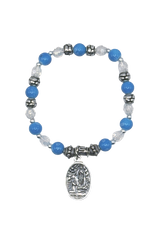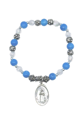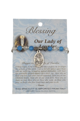 This bracelet features bright blue beads, iridescent crystal beads, silver beads and a silver-toned, two-sided Our Lady of Lourdes Charm. Bracelet includes an Our Lady of Lourdes prayer card.