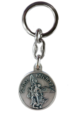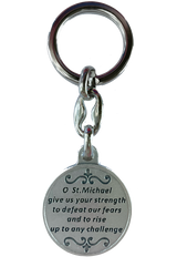 3" St. Michael key ring with silver-one charm. St. Michael is pictured on front with prayer to St. Michael on back. Made in Italy.