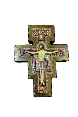 With thick cut wood and a beautiful gold leaf border, this San Damiano cross is a quality replica of the original San Damiano Cross which hangs in the Basilica of St. Clare in Assisi, Italy. It features fine details, outstanding quality, and comes with a mountable backing for a hook or nail.